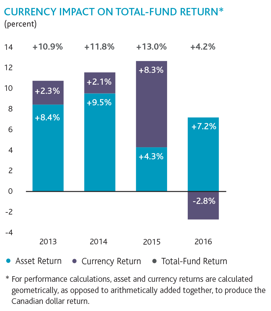 Ontario Teachers' has investments in 37 global currencies and in more than 50 countries. In those local currencies, the return on our investments was 7.2%. Converting the return on those investments back into Canadian dollars, the currency in which pensions are paid, had a -2.8% impact on the Plan's total-fund rate of return. By contrast, currency gains added 8.3% in 2015.