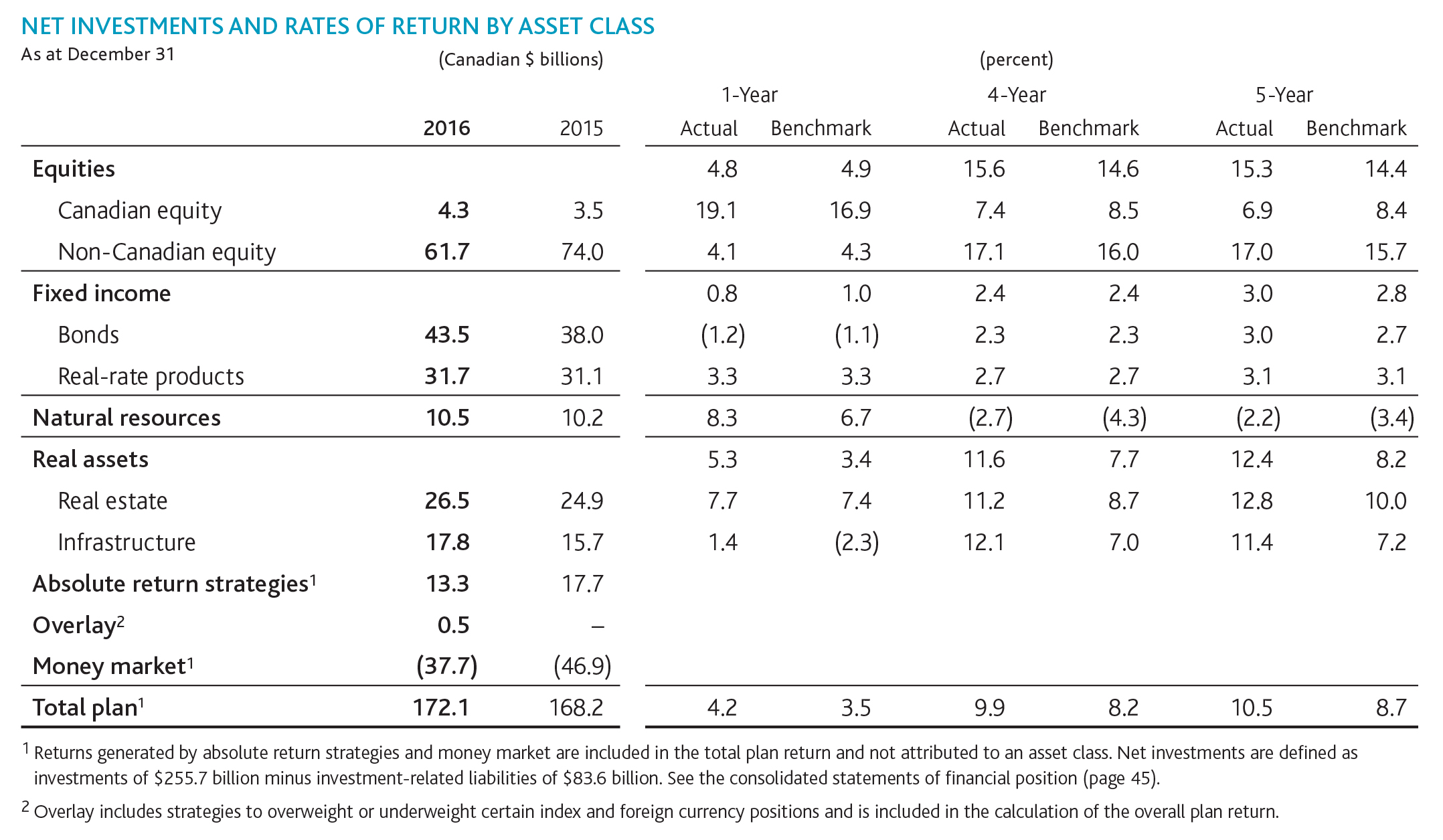 Real assets, a group that consists of real estate and infrastructure, had total assets of $44.3 billion at year-end, compared to $40.6 billion a year earlier. The real estate portfolio, managed by the plan's subsidiary Cadillac Fairview, totaled $26.5 billion in net assets at year-end and returned 7.7%, exceeding the 7.4% benchmark. The infrastructure portfolio had $17.8 billion in assets at year-end, up from $15.7 billion a year earlier. New investments and higher valuations for existing assets were partly offset by the impact of a stronger Canadian dollar. Infrastructure assets delivered a one-year return of 1.4%, outperforming the benchmark return of -2.3% (As country benchmarks are assigned to each asset class, conversion back to Canadian dollars results in a negative benchmark).
