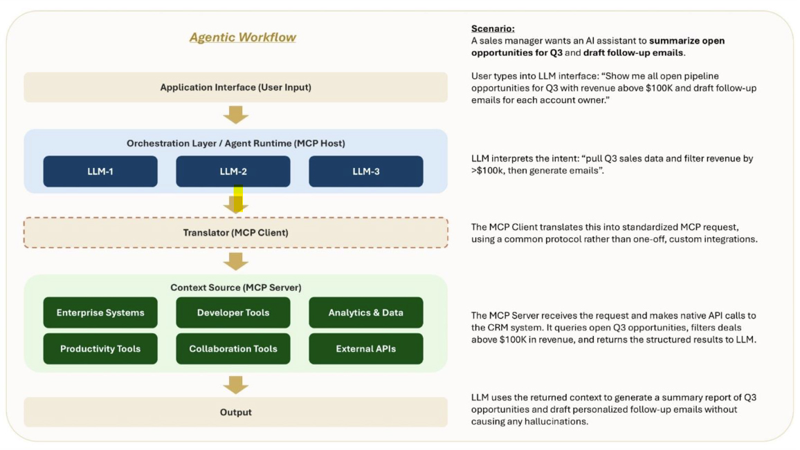 The diagram below shows this in action. A user enters a prompt, the model interprets their intent and, very crucially, instead of taking a guess, it reaches out to real context for further clarification. The MCP client acts as the translator, converting the user’s intent into standardized MCP requests. MCP servers then handle the actual execution: exposing secured, auditable access to context sources such as CRMs, analytics tools, dev platforms, and productivity apps, and making the underlying API calls on the model’s behalf. These systems return structured results, which the models use to generate useful, context-aware outputs rather than a plausible-sounding paragraph. Most importantly, you don’t need to write N x M pieces of code to do this.